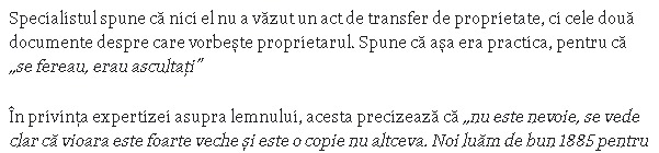 Doi: „În privința expertizei asupra lemnului, acesta precizează că «nu este nevoie, se vede clar că vioara este foarte veche»“. Ce expertiză deține CZT, când orice expertiză începe abia după ce orice „se vede“ sfârșește, dispare din discuție? Ce expert este acela care spune „se vede“ și „noi luăm de bun“ în loc de „analiza chimică în orb cu eșantioane din mai multe viori Wolff 1885 arată că“?
