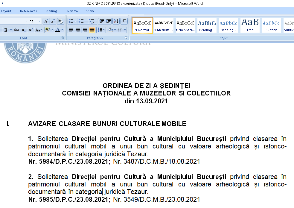 Luni 13 septembrie se întrunește Comisia Națională a Muzeelor și Colecțiilor (CNMC). Va fi o ședință extraordinară, anunțată cu întârziere și deocamdată cu o ordine de zi „anonimizată“ (?), conform titlului fișierului, mai greu depistabil, afișat recent de CNMC. Comisia Națională a Muzeelor și Colecțiilor | Ministerul Culturii (cultura.ro).