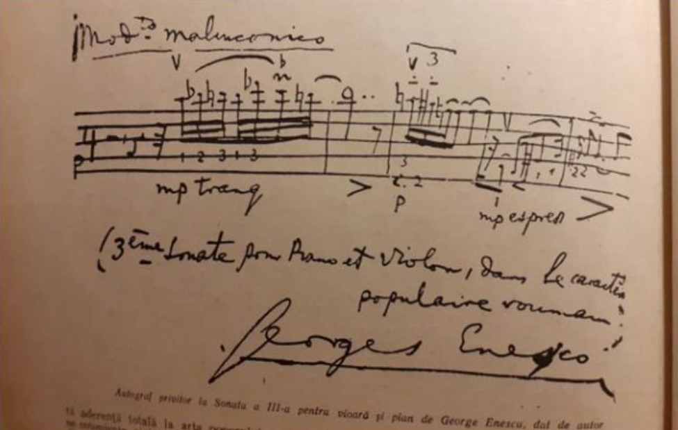 Pentru o asemenea capodoperă constați imediat că sînt mult mai puține versiuni autografe păstrate (nu doar la Muzeu: peste tot unde sînt manuscrise muzicale Enescu) decît în cazuri similare. Deschizi apoi fabulosul studiu al regretatei Speranța Rădulescu, „Caractère spécifique roumain dans le langage harmonique de la IIIe Sonate pour piano et violon de Georges Enesco“, din Enesciana II-III (1981): Georges Enesco – musician complexe, Centre d’études « Georges Enesco », Bucharest: Editura Muzicală, 1981, pp. 75-94, cu toate acele comparații din muzica populară (cum e „Cunosc c-am îmbătrînit“, cules la Runcu-Gorj în 1966), dar toate exemplificările din Enescu sînt tipic deja din partitura transcrisă/tipărită, nu din manuscrise. Nimic aici, să mergem mai înapoi. Știm bine că Enescu obișnuia să dedice și semneze cîte un fragment de operă muzicală – cîteva măsuri îndeobște, deloc cu fără indicații complete – unor prieteni muzicieni colaboratori. Incipitul de partitură pe care îl semnalez aici nu este o astfel de dedicație. O astfel de dedicație cu chiar Sonata a III-a apare însă la Tudor Ciortea, în analiza sa la „Sonata a III-a pentru vioară și pian de George Enescu“, Muzica 5 (1955), no. 5 (Mai): Număr închinat lui George Enescu, pp. 37-44 (aici 44), rarul număr oferit publicului în chiar luna morții lui Enescu. Se pot observa cu ușurință diferențele: e un simplu autograf, cum nu e partitura cu ștampila Drăghici.