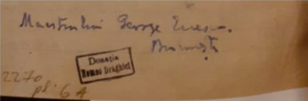 Esențial e că putem citi bine „Colecția“ și că observăm dimensiunea identică a ștampilei. E timpul să trecem însă la un alt tip de ștampilă a lui Drăghici, de care nu am dorit să scriu înainte de a o descoperi pe prima, cea cu penala „Colecție“. Așa cum se poate constata comod din listele manuscriselor non-muzicale deja clasate în patrimoniul bunurilor mobile românești (din manuscrisele muzicale abia primul a fost recomandat spre clasare în octombrie 2021… în urma licitației Historic, altele așteptînd rezoluțiile după ce au fost expertizate de Muzeu foarte recent), există manuscrise Enescu care au primit, în condiții încă neelucidate, ștampila „Donația Romeo Drăghici“. Adică Drăghici și-a și însușit unele pentru sine, pe care apoi le-a vîndut altora (Vasilescu-Capsali e exemplul recent documentat, din care s-au vîndut și la Artmark, și la Historic), și a și ținut să specifice că el le donează, deși nu puteau face parte cu nici un chip din achizițiile lui! Iată chiar exemplul pe care l-am citat în articolul recent: scrisoarea de restriște către iubitul său Fleg. CIMEC menționează (dar nu reproduce): Pe fila a 2-a a documentului apare ştampila de formă dreptunghiulară (culoare roşie) „Donaţia Romeo Drăghici‟. A furat, dar a și donat. Și anume cu ștampile personale separate.