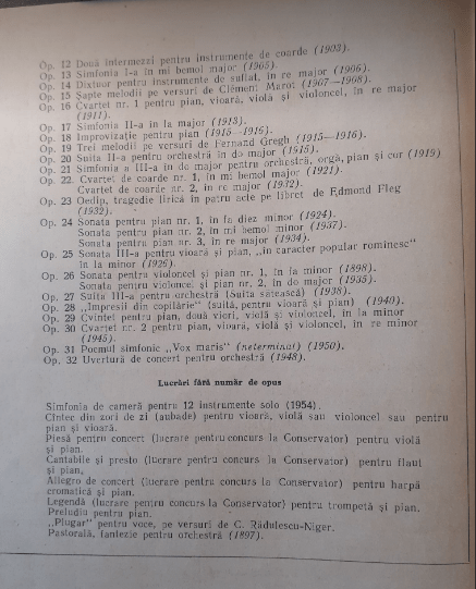 §2. Ceea ce știu ca de totdeauna toți este că Enescu și-a atribuit el însuși operei lui numai 33 de numere de opus. O opinie larg întâlnită, nelipsită de un ce funest, spune totodată că Enescu ar fi un compozitor cu o operă restrânsă. Dar în urmă cu 67 de ani, puține zile după ce întreaga lume a aflat vestea morții lui Enescu, autoritățile muzicale și mai puțin muzicale de la București au pregătit un număr (5, al chiar lunii mai) din revista Muzica, unul „închinat lui George Enescu“. Pentru a vedea cât de îndepărtat înrădăcinate sunt unele dintre stereotipurile muzicale și extramuzicale cu privire la Enescu, privit cum e rareori cu prospețime la intersecția necesară a mai multor bresle, să amintesc că la prima publicație postumă nu erau nici măcar 33, ci încă 32: iată, uluitoarea Simfonie de cameră pentru 12 instrumente soliste (încheiată în 1954, corectată împreună cu discipolul său și prietenul său vechi Marcel Mihalovici) nici nu era încă recunoscută cum o recunoscuse firește el. Nici măcar nu e presimțit un Catalog. E un simplu „Index de lucrări“, cu menționarea poate subconștientă a multora fără număr de opus: iată-l.